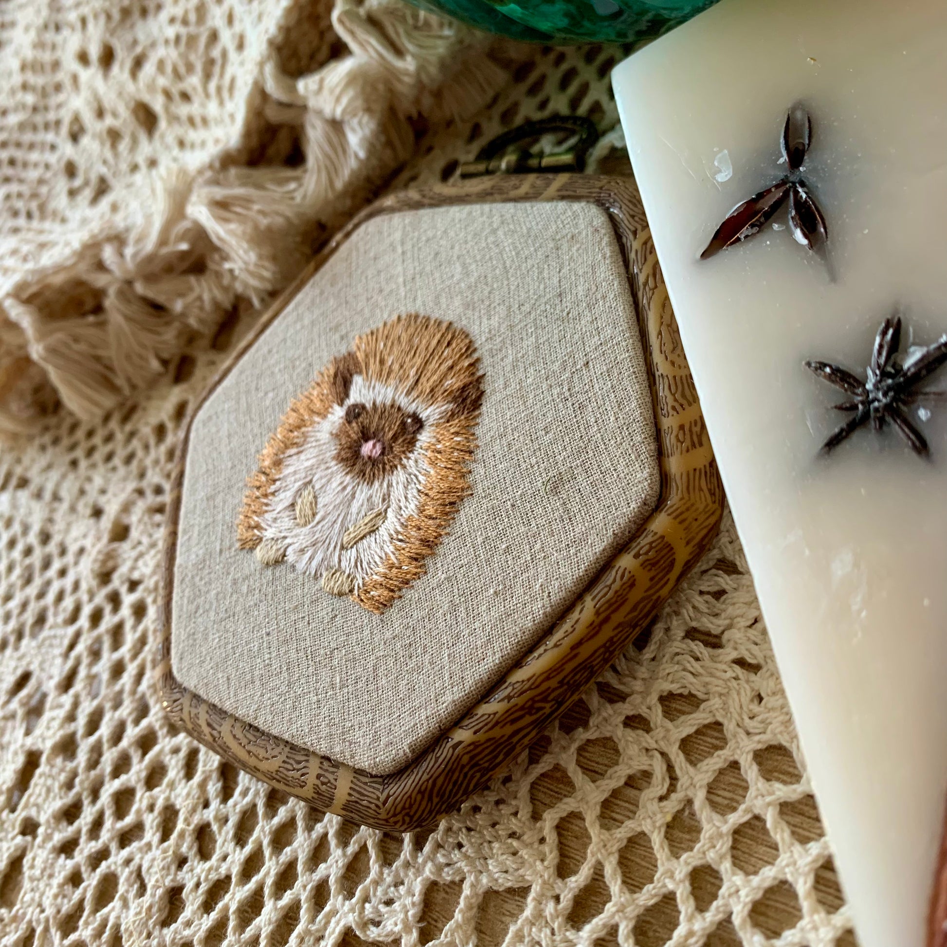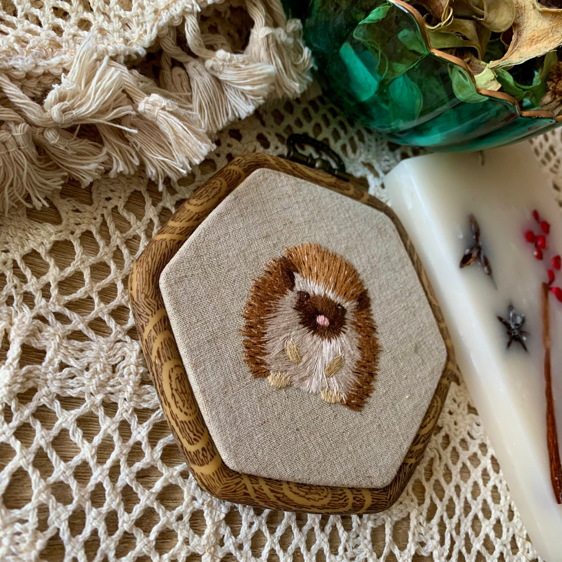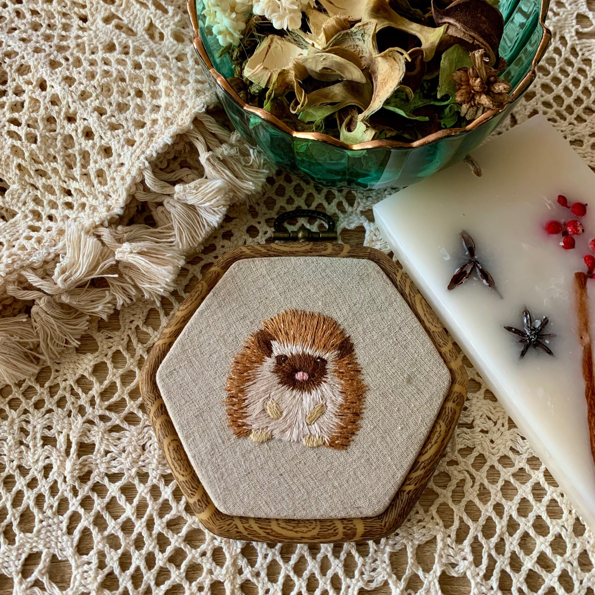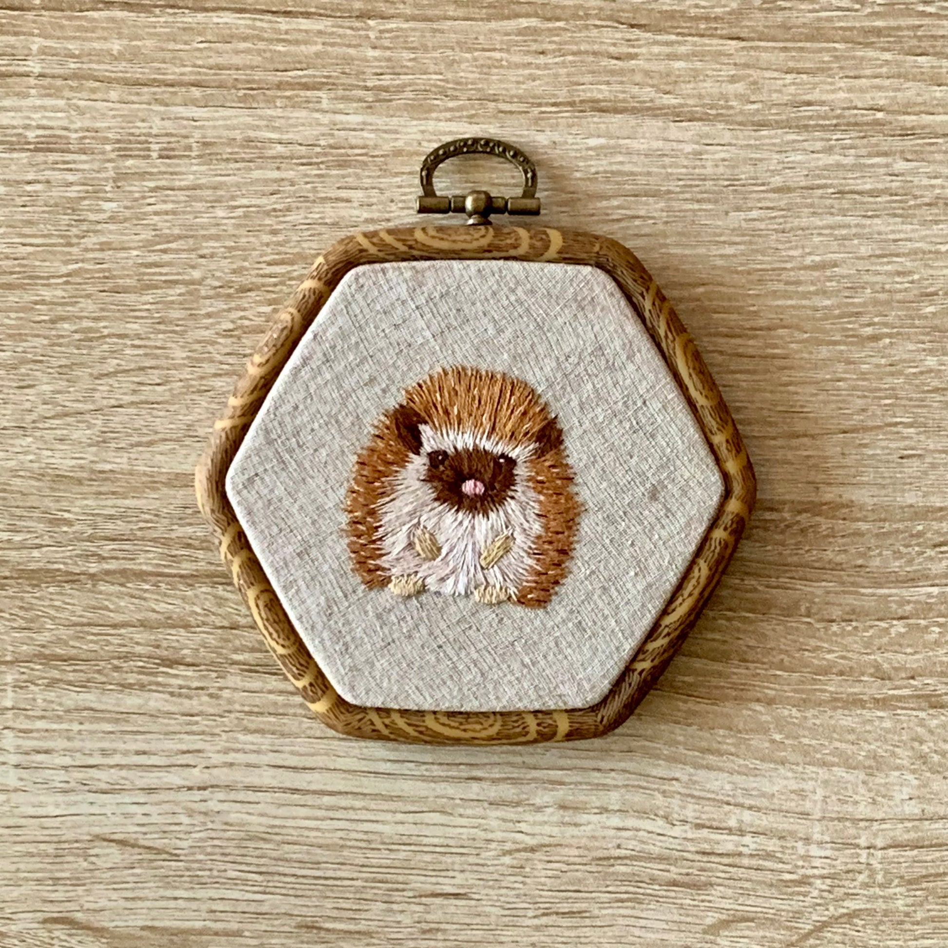 *Broderie sur cadre hexagonal imitation bois.